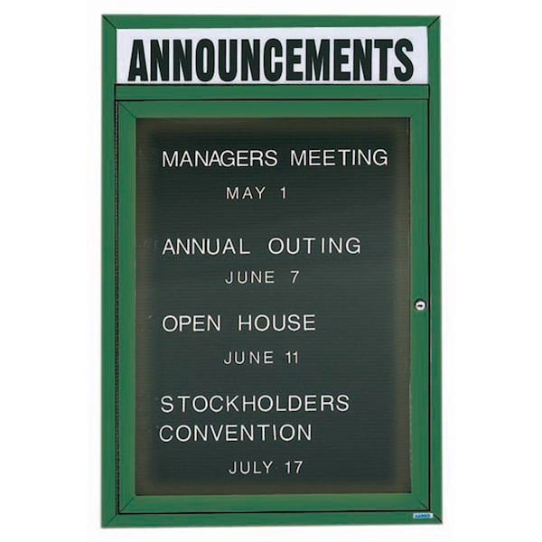 Illuminated Outdoor Enclosed Aluminum Directory Boards are made of custom extruded parts engineered to provide accurate, durable and handsome cabinets. All corners are neatly mitered and assembled with Heavy duty reinforcements and fasteners. The black vinyl covered grooved rear panel designed to accommodate changeable letters with tabs spaced on 1/4" centers. Supplied with a blank header panel, ready for your custom vinyl lettering. Lettering is not included and must be applied by the customer. Green Powder Coated Finish Size 24"Hx18"W 1 Door