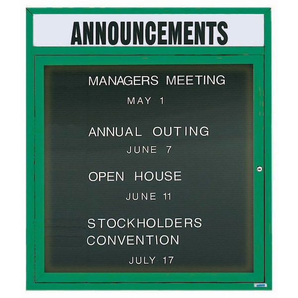 Illuminated Outdoor Enclosed Aluminum Directory Boards are made of custom extruded parts engineered to provide accurate, durable and handsome cabinets. All corners are neatly mitered and assembled with Heavy duty reinforcements and fasteners. The black vinyl covered grooved rear panel designed to accommodate changeable letters with tabs spaced on 1/4" centers. Supplied with a blank header panel, ready for your custom vinyl lettering. Lettering is not included and must be applied by the customer. Green Powder Coated Finish Size 36"Hx30"W 1 Door