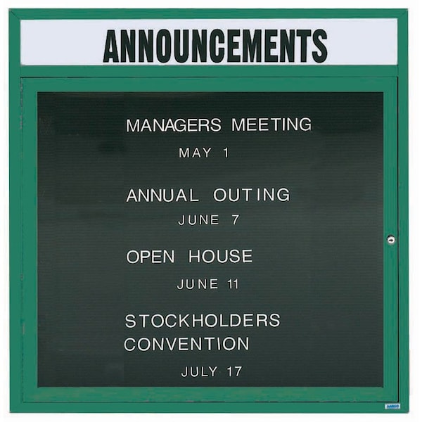 Illuminated Outdoor Enclosed Aluminum Directory Boards are made of custom extruded parts engineered to provide accurate, durable and handsome cabinets. All corners are neatly mitered and assembled with Heavy duty reinforcements and fasteners. The black vinyl covered grooved rear panel designed to accommodate changeable letters with tabs spaced on 1/4" centers. Supplied with a blank header panel, ready for your custom vinyl lettering. Lettering is not included and must be applied by the customer. Green Powder Coated Finish Size 36"Hx36"W 1 Door