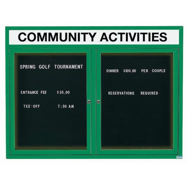 Illuminated Outdoor Enclosed Aluminum Directory Boards are made of custom extruded parts engineered to provide accurate, durable and handsome cabinets. All corners are neatly mitered and assembled with Heavy duty reinforcements and fasteners. The black vinyl covered grooved rear panel designed to accommodate changeable letters with tabs spaced on 1/4" centers. Supplied with a blank header panel, ready for your custom vinyl lettering. Lettering is not included and must be applied by the customer. Green Powder Coated Finish Size 36"Hx48"W 2 Doors
