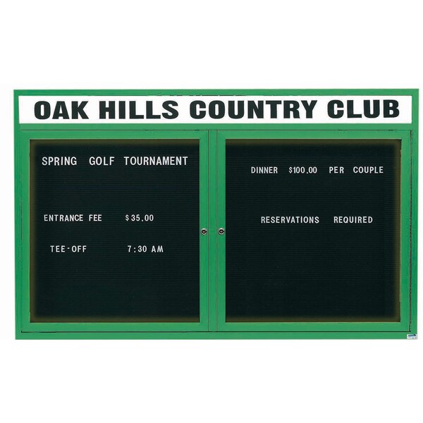 Illuminated Outdoor Enclosed Aluminum Directory Boards are made of custom extruded parts engineered to provide accurate, durable and handsome cabinets. All corners are neatly mitered and assembled with Heavy duty reinforcements and fasteners. The black vinyl covered grooved rear panel designed to accommodate changeable letters with tabs spaced on 1/4" centers. Supplied with a blank header panel, ready for your custom vinyl lettering. Lettering is not included and must be applied by the customer. Green Powder Coated Finish Size 36"Hx60"W 2 Doors