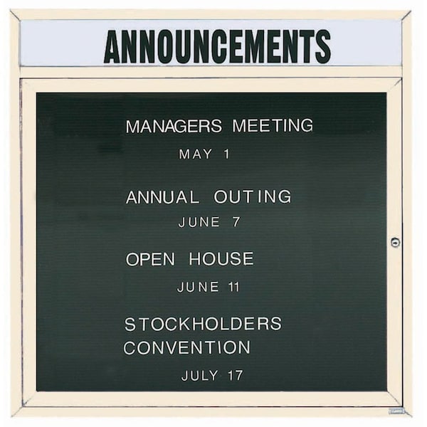 Illuminated Outdoor Enclosed Aluminum Directory Boards are made of custom extruded parts engineered to provide accurate, durable and handsome cabinets. All corners are neatly mitered and assembled with Heavy duty reinforcements and fasteners. The black vinyl covered grooved rear panel designed to accommodate changeable letters with tabs spaced on 1/4" centers. Supplied with a blank header panel, ready for your custom vinyl lettering. Lettering is not included and must be applied by the customer. Ivory Powder Coated Finish Size 36"Hx36"W 1 Door