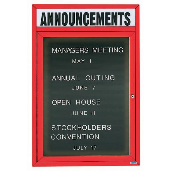 Illuminated Outdoor Enclosed Aluminum Directory Boards are made of custom extruded parts engineered to provide accurate, durable and handsome cabinets. All corners are neatly mitered and assembled with Heavy duty reinforcements and fasteners. The black vinyl covered grooved rear panel designed to accommodate changeable letters with tabs spaced on 1/4" centers. Supplied with a blank header panel, ready for your custom vinyl lettering. Lettering is not included and must be applied by the customer. Red Powder Coated Finish Size 24"Hx18"W 1 Door