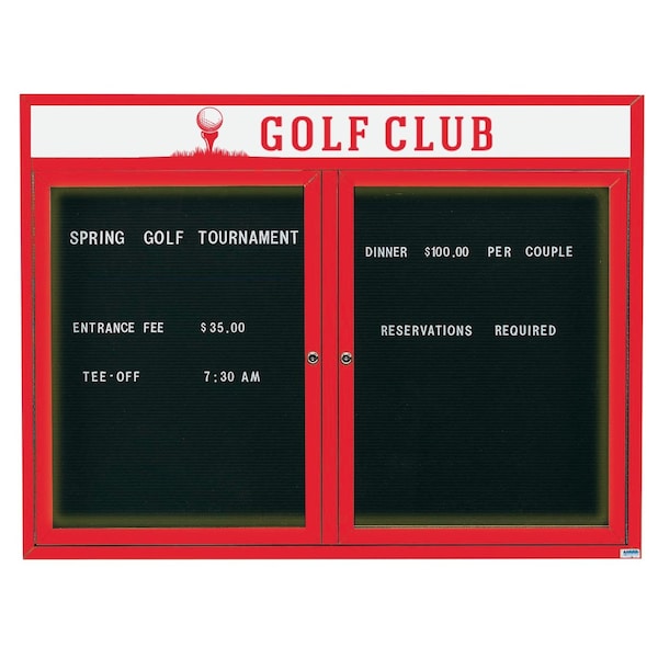 Illuminated Outdoor Enclosed Aluminum Directory Boards are made of custom extruded parts engineered to provide accurate, durable and handsome cabinets. All corners are neatly mitered and assembled with Heavy duty reinforcements and fasteners. The black vinyl covered grooved rear panel designed to accommodate changeable letters with tabs spaced on 1/4" centers. Supplied with a blank header panel, ready for your custom vinyl lettering. Lettering is not included and must be applied by the customer. Red Powder Coated Finish Size 36"Hx48"W 2 Doors