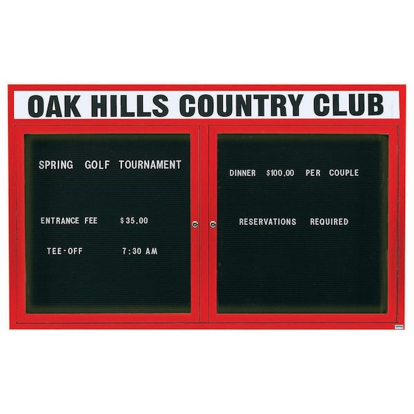Illuminated Outdoor Enclosed Aluminum Directory Boards are made of custom extruded parts engineered to provide accurate, durable and handsome cabinets. All corners are neatly mitered and assembled with Heavy duty reinforcements and fasteners. The black vinyl covered grooved rear panel designed to accommodate changeable letters with tabs spaced on 1/4" centers. Supplied with a blank header panel, ready for your custom vinyl lettering. Lettering is not included and must be applied by the customer. Red Powder Coated Finish Size 48"Hx72"W 2 Doors