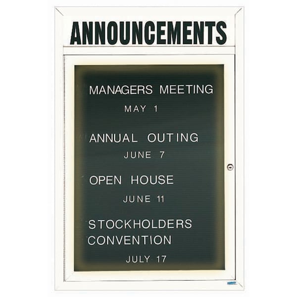 Illuminated Outdoor Enclosed Aluminum Directory Boards are made of custom extruded parts engineered to provide accurate, durable and handsome cabinets. All corners are neatly mitered and assembled with Heavy duty reinforcements and fasteners. The black vinyl covered grooved rear panel designed to accommodate changeable letters with tabs spaced on 1/4" centers. Supplied with a blank header panel, ready for your custom vinyl lettering. Lettering is not included and must be applied by the customer. White Powder Coated Finish Size 24"Hx18"W 1 Door