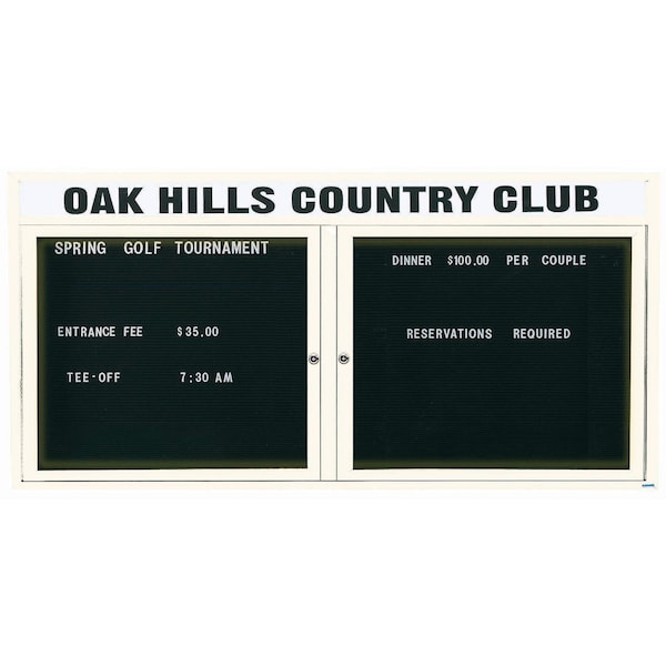 Illuminated Outdoor Enclosed Aluminum Directory Boards are made of custom extruded parts engineered to provide accurate, durable and handsome cabinets. All corners are neatly mitered and assembled with Heavy duty reinforcements and fasteners. The black vinyl covered grooved rear panel designed to accommodate changeable letters with tabs spaced on 1/4" centers. Supplied with a blank header panel, ready for your custom vinyl lettering. Lettering is not included and must be applied by the customer. White Powder Coated Finish Size 36"Hx72"W 2 Doors