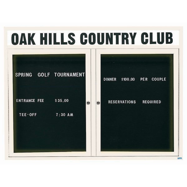 Illuminated Outdoor Enclosed Aluminum Directory Boards are made of custom extruded parts engineered to provide accurate, durable and handsome cabinets. All corners are neatly mitered and assembled with Heavy duty reinforcements and fasteners. The black vinyl covered grooved rear panel designed to accommodate changeable letters with tabs spaced on 1/4" centers. Supplied with a blank header panel, ready for your custom vinyl lettering. Lettering is not included and must be applied by the customer. White Powder Coated Finish Size 48"Hx60"W 2 Doors