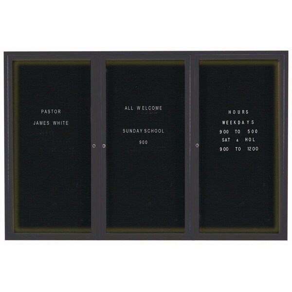 Illuminated Outdoor Enclosed Aluminum Directory Boards are made of custom extruded parts engineered to provide accurate, durable and handsome cabinets. All corners are neatly mitered and assembled with Heavy duty reinforcements and fasteners. The black vinyl covered grooved rear panel designed to accommodate changeable letters with tabs spaced on 1/4" centers. Black Powder Coated Finish Size 48"Hx72"W 3 Doors