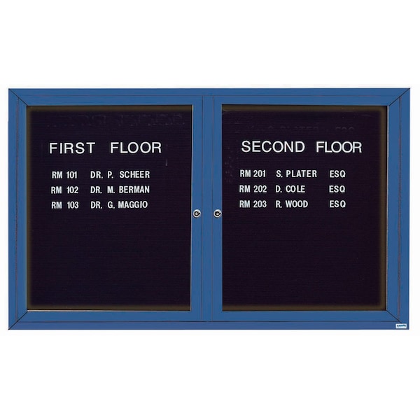 Illuminated Outdoor Enclosed Aluminum Directory Boards are made of custom extruded parts engineered to provide accurate, durable and handsome cabinets. All corners are neatly mitered and assembled with Heavy duty reinforcements and fasteners. The black vinyl covered grooved rear panel designed to accommodate changeable letters with tabs spaced on 1/4" centers. Blue Powder Coated Finish Size 36"Hx60"W 2 Doors