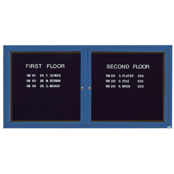 Illuminated Outdoor Enclosed Aluminum Directory Boards are made of custom extruded parts engineered to provide accurate, durable and handsome cabinets. All corners are neatly mitered and assembled with Heavy duty reinforcements and fasteners. The black vinyl covered grooved rear panel designed to accommodate changeable letters with tabs spaced on 1/4" centers. Blue Powder Coated Finish Size 36"Hx72"W 2 Doors