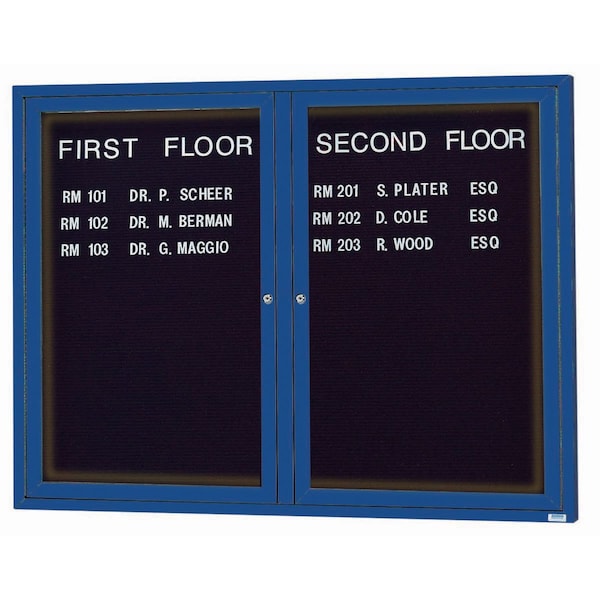 Illuminated Outdoor Enclosed Aluminum Directory Boards are made of custom extruded parts engineered to provide accurate, durable and handsome cabinets. All corners are neatly mitered and assembled with Heavy duty reinforcements and fasteners. The black vinyl covered grooved rear panel designed to accommodate changeable letters with tabs spaced on 1/4" centers. Blue Powder Coated Finish Size 48"Hx60"W 2 Doors