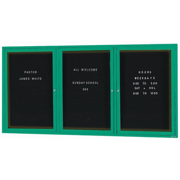Illuminated Outdoor Enclosed Aluminum Directory Boards are made of custom extruded parts engineered to provide accurate, durable and handsome cabinets. All corners are neatly mitered and assembled with Heavy duty reinforcements and fasteners. The black vinyl covered grooved rear panel designed to accommodate changeable letters with tabs spaced on 1/4" centers. Green Powder Coated Finish Size 36"Hx72"W 3 Doors