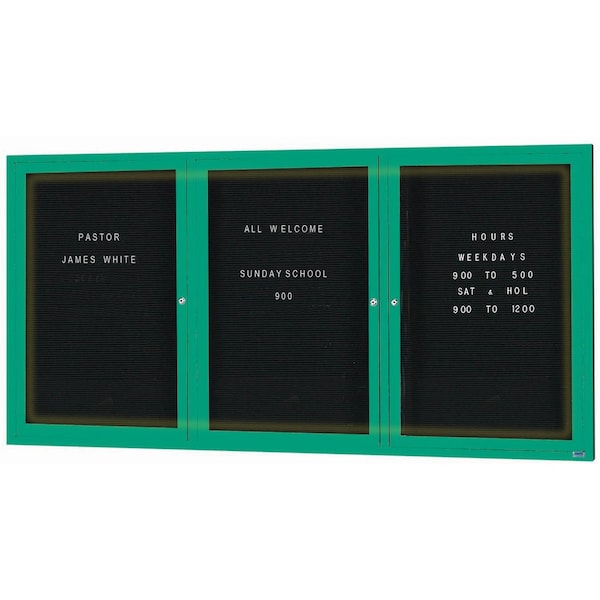 Illuminated Outdoor Enclosed Aluminum Directory Boards are made of custom extruded parts engineered to provide accurate, durable and handsome cabinets. All corners are neatly mitered and assembled with Heavy duty reinforcements and fasteners. The black vinyl covered grooved rear panel designed to accommodate changeable letters with tabs spaced on 1/4" centers. Green Powder Coated Finish Size 48"Hx96"W 3 Doors