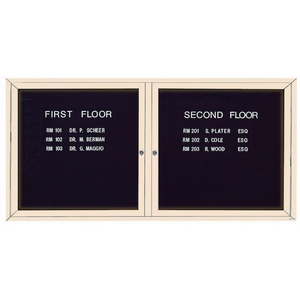 Illuminated Outdoor Enclosed Aluminum Directory Boards are made of custom extruded parts engineered to provide accurate, durable and handsome cabinets. All corners are neatly mitered and assembled with Heavy duty reinforcements and fasteners. The black vinyl covered grooved rear panel designed to accommodate changeable letters with tabs spaced on 1/4" centers. A. Ivory Powder Coated Finish Size 36"Hx72"W 2 Doors