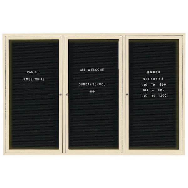 Illuminated Outdoor Enclosed Aluminum Directory Boards are made of custom extruded parts engineered to provide accurate, durable and handsome cabinets. All corners are neatly mitered and assembled with Heavy duty reinforcements and fasteners. The black vinyl covered grooved rear panel designed to accommodate changeable letters with tabs spaced on 1/4" centers. Ivory Powder Coated Finish Size 48"Hx72"W 3 Doors