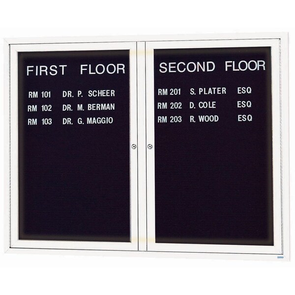 Illuminated Outdoor Enclosed Aluminum Directory Boards are made of custom extruded parts engineered to provide accurate, durable and handsome cabinets. All corners are neatly mitered and assembled with Heavy duty reinforcements and fasteners. The black vinyl covered grooved rear panel designed to accommodate changeable letters with tabs spaced on 1/4" centers. White Powder Coated Finish Size 48"Hx60"W 2 Doors