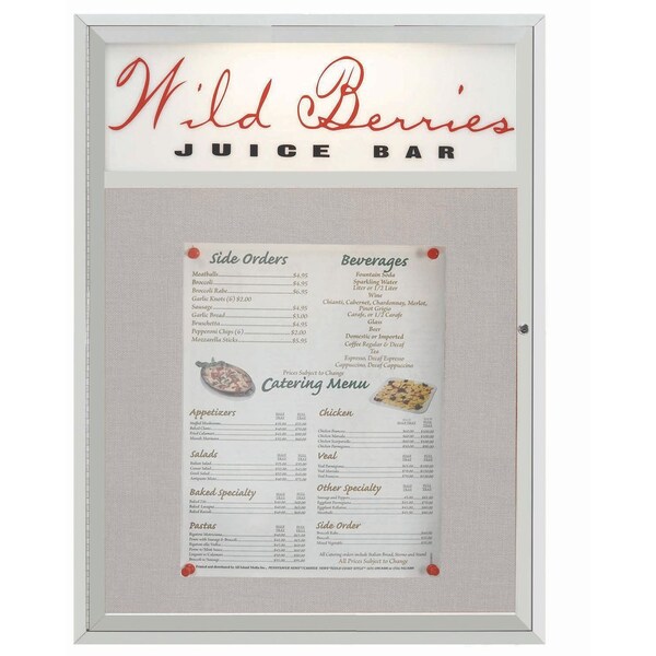 Indoor/Outdoor Enclosed Bulletin Board with lockable doors features satin anodized aluminum trim, overhead lighting, standard vinyl interior posting surface and concealed mounting hangers. Supplied with a blank header panel, ready for your custom vinyl lettering. Lettering is not included and must be applied by the customer. Size: 48"Hx36"W 1 Door unit.