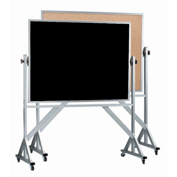 Mobile Reversible Freestanding Boards are both Writing Surface and Bulletin Board. Mobile Reversible Freestanding Combination Board is Black Chalkboard on One Side and Natural Pebble Grain Cork Bulletin Board on the Other. Aluminum Frame with a Clear Satin Anodized Finish. Equipped with locking swivel casters for easy mobility. Units are shipped KD and assemble easily with basic tools. Board Size 36"Hx48"W