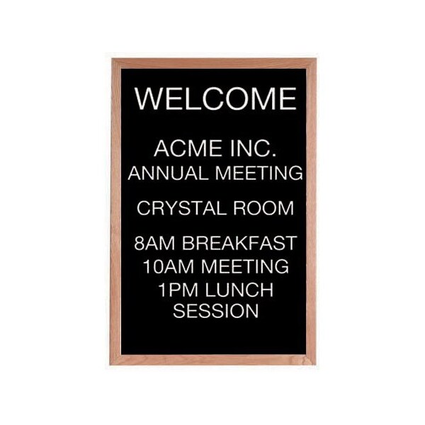 A classic black felt covered board that is precision grooved on 1/4" centers to accept universal quick change letters handsomely framed in solid red oak. Size 18"Hx12"W