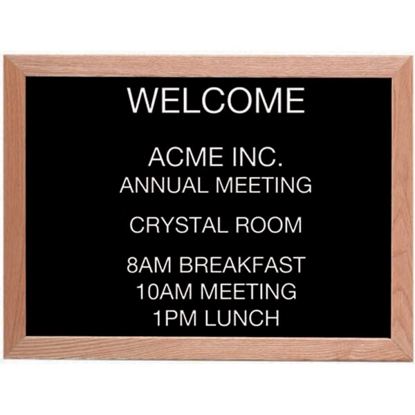 A classic black felt covered board that is precision grooved on 1/4" centers to accept universal quick change letters handsomely framed in solid red oak. Size 18"Hx24"W