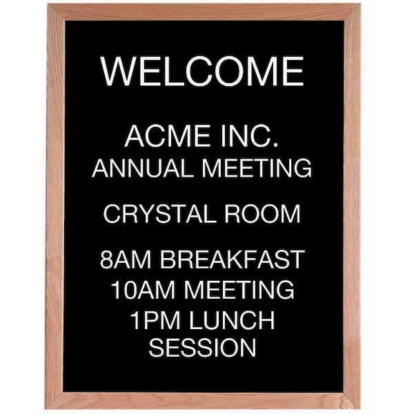 A classic black felt covered board that is precision grooved on 1/4" centers to accept universal quick change letters handsomely framed in solid red oak. Size 30"Hx24"W