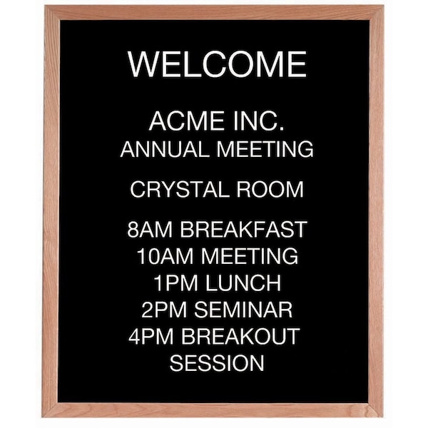 A classic black felt covered board that is precision grooved on 1/4" centers to accept universal quick change letters handsomely framed in solid red oak. Size 36"Hx30"W