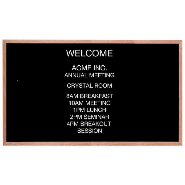 A classic black felt covered board that is precision grooved on 1/4" centers to accept universal quick change letters handsomely framed in solid red oak. Size 36"Hx60"W
