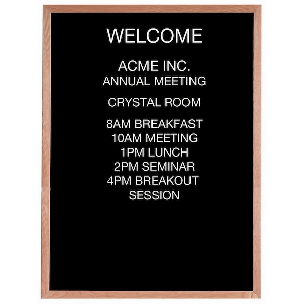 A classic black felt covered board that is precision grooved on 1/4" centers to accept universal quick change letters handsomely framed in solid red oak. Size 48"Hx36"W