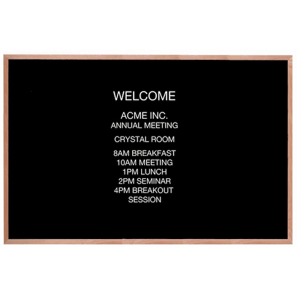 A classic black felt covered board that is precision grooved on 1/4" centers to accept universal quick change letters handsomely framed in solid red oak. Size 48"Hx72"W