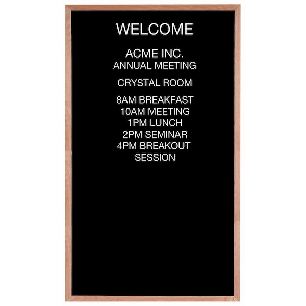 A classic black felt covered board that is precision grooved on 1/4" centers to accept universal quick change letters handsomely framed in solid red oak. Size 60"Hx36"W