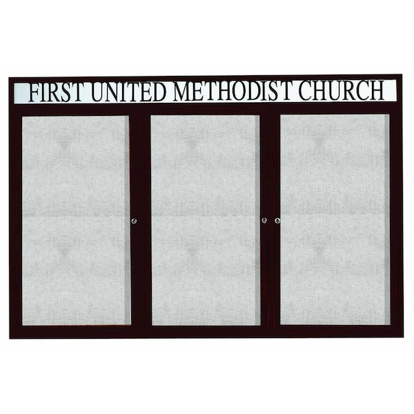 Outdoor Enclosed Aluminum Bulletin Boards are made of custom extruded parts engineered to provide accurate, durable and handsome cabinets. All corners are neatly mitered and assembled with Heavy duty reinforcements and fasteners. Units are weatherized. Back panel is an attractive standard vinyl. Supplied with a blank header panel, ready for your custom vinyl lettering. Lettering is not included and must be applied by the customer. Finish Bronze Satin Anodized Size 48"Hx72"W 3 Doors