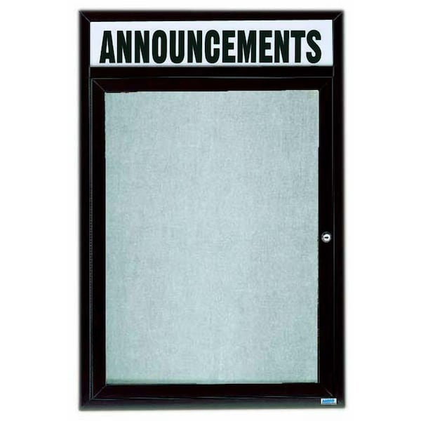 Outdoor Enclosed Aluminum Bulletin Boards are made of custom extruded parts engineered to provide accurate, durable and handsome cabinets. All corners are neatly mitered and assembled with Heavy duty reinforcements and fasteners. Units are weatherized. Back panel is an attractive standard vinyl. Supplied with a blank header panel, ready for your custom vinyl lettering. Lettering is not included and must be applied by the customer. Finish Bronze Satin Anodized Size 48"Hx36"W 1 Door