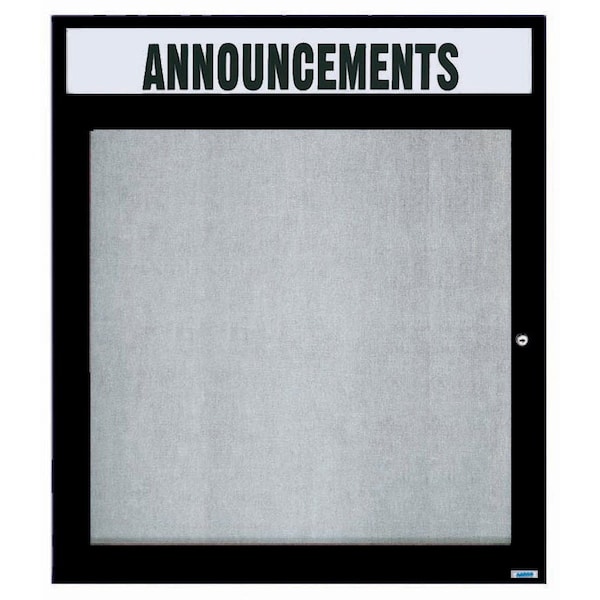 Outdoor Enclosed Aluminum Bulletin Boards are made of custom extruded parts engineered to provide accurate, durable and handsome cabinets. All corners are neatly mitered and assembled with Heavy duty reinforcements and fasteners. Units are weatherized. Back panel is an attractive standard vinyl. Supplied with a blank header panel, ready for your custom vinyl lettering. Lettering is not included and must be applied by the customer. Black Powder Coated Finish Size 36"Hx30"W 1 Door