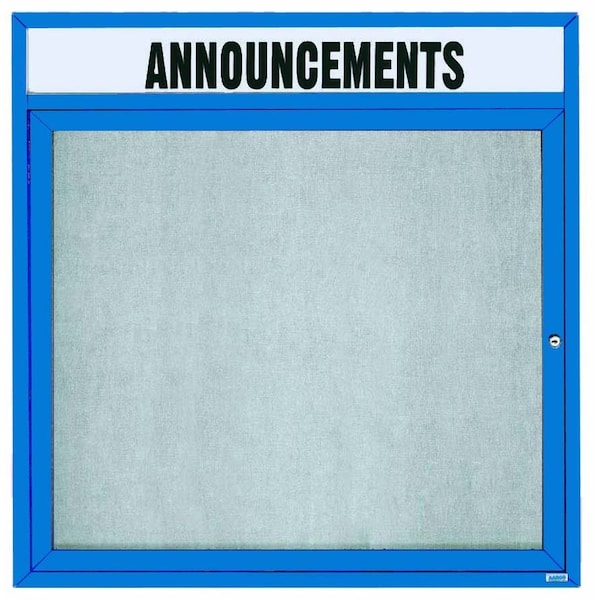 Outdoor Enclosed Aluminum Bulletin Boards are made of custom extruded parts engineered to provide accurate, durable and handsome cabinets. All corners are neatly mitered and assembled with Heavy duty reinforcements and fasteners. Units are weatherized. Back panel is an attractive standard vinyl. Supplied with a blank header panel, ready for your custom vinyl lettering. Lettering is not included and must be applied by the customer. Blue Powder Coated Finish Size 36"Hx36"W 1 Door