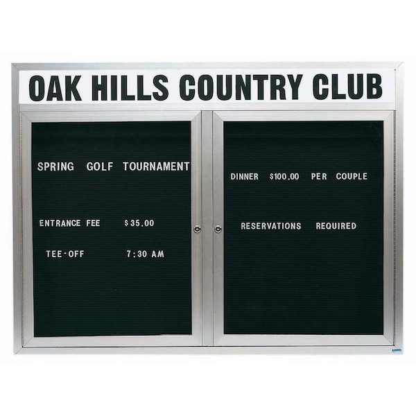 Outdoor Enclosed Aluminum Directory Boards are made of custom extruded parts engineered to provide accurate, durable and handsome cabinets. All corners are neatly mitered and assembled with Heavy duty reinforcements and fasteners. The black vinyl covered grooved rear panel designed to accommodate changeable letters with tabs spaced on 1/4" centers. Supplied with a blank header panel, ready for your custom vinyl lettering. Lettering is not included and must be applied by the customer. Finish Clear Satin Anodized Size 48"Hx60"W 2 Doors