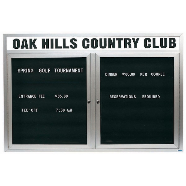 Outdoor Enclosed Aluminum Directory Boards are made of custom extruded parts engineered to provide accurate, durable and handsome cabinets. All corners are neatly mitered and assembled with Heavy duty reinforcements and fasteners. The black vinyl covered grooved rear panel designed to accommodate changeable letters with tabs spaced on 1/4" centers. Supplied with a blank header panel, ready for your custom vinyl lettering. Lettering is not included and must be applied by the customer. Finish Clear Satin Anodized Size 48"Hx72"W 2 Doors