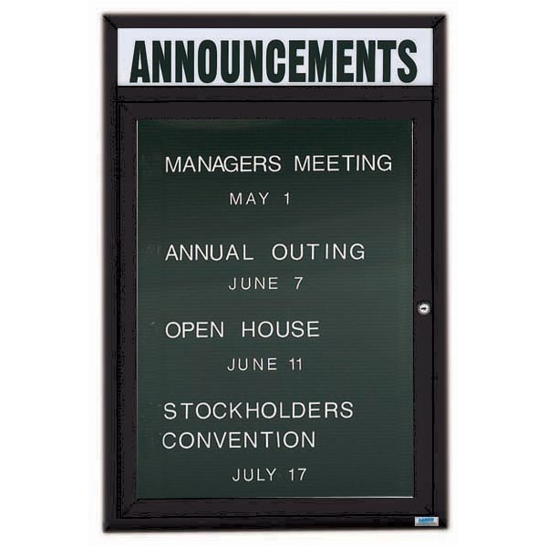 Outdoor Enclosed Aluminum Directory Boards are made of custom extruded parts engineered to provide accurate, durable and handsome cabinets. All corners are neatly mitered and assembled with Heavy duty reinforcements and fasteners. The black vinyl covered grooved rear panel designed to accommodate changeable letters with tabs spaced on 1/4" centers. Supplied with a blank header panel, ready for your custom vinyl lettering. Lettering is not included and must be applied by the customer. Black Powder Coated Finish Size 24"Hx18"W 1 Door