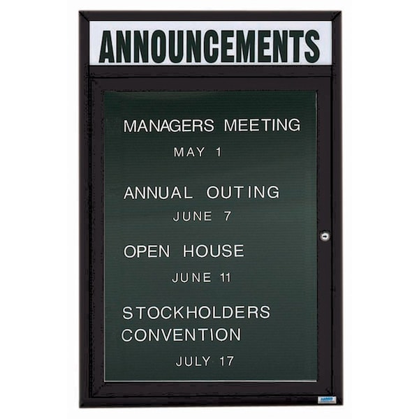 Outdoor Enclosed Aluminum Directory Boards are made of custom extruded parts engineered to provide accurate, durable and handsome cabinets. All corners are neatly mitered and assembled with Heavy duty reinforcements and fasteners. The black vinyl covered grooved rear panel designed to accommodate changeable letters with tabs spaced on 1/4" centers. Supplied with a blank header panel, ready for your custom vinyl lettering. Lettering is not included and must be applied by the customer. Black Powder Coated Finish Size 36"Hx24"W 1 Door