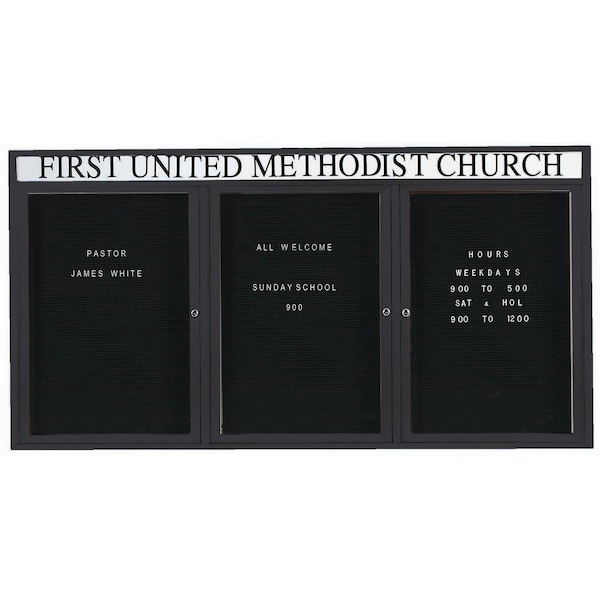 Outdoor Enclosed Aluminum Directory Boards are made of custom extruded parts engineered to provide accurate, durable and handsome cabinets. All corners are neatly mitered and assembled with Heavy duty reinforcements and fasteners. The black vinyl covered grooved rear panel designed to accommodate changeable letters with tabs spaced on 1/4" centers. Supplied with a blank header panel, ready for your custom vinyl lettering. Lettering is not included and must be applied by the customer. Black Powder Coated Finish Size 36"Hx72"W 3 Doors