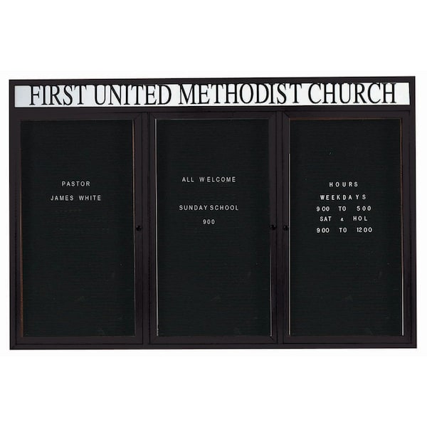 Outdoor Enclosed Aluminum Directory Boards are made of custom extruded parts engineered to provide accurate, durable and handsome cabinets. All corners are neatly mitered and assembled with Heavy duty reinforcements and fasteners. The black vinyl covered grooved rear panel designed to accommodate changeable letters with tabs spaced on 1/4" centers. Supplied with a blank header panel, ready for your custom vinyl lettering. Lettering is not included and must be applied by the customer. Black Powder Coated Finish Size 48"Hx72"W 3 Doors