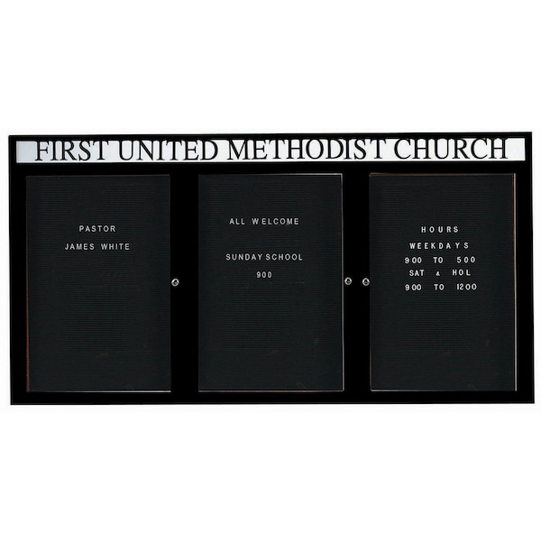 Outdoor Enclosed Aluminum Directory Boards are made of custom extruded parts engineered to provide accurate, durable and handsome cabinets. All corners are neatly mitered and assembled with Heavy duty reinforcements and fasteners. The black vinyl covered grooved rear panel designed to accommodate changeable letters with tabs spaced on 1/4" centers. Supplied with a blank header panel, ready for your custom vinyl lettering. Lettering is not included and must be applied by the customer. Black Powder Coated Finish Size 48"Hx96"W 3 Doors