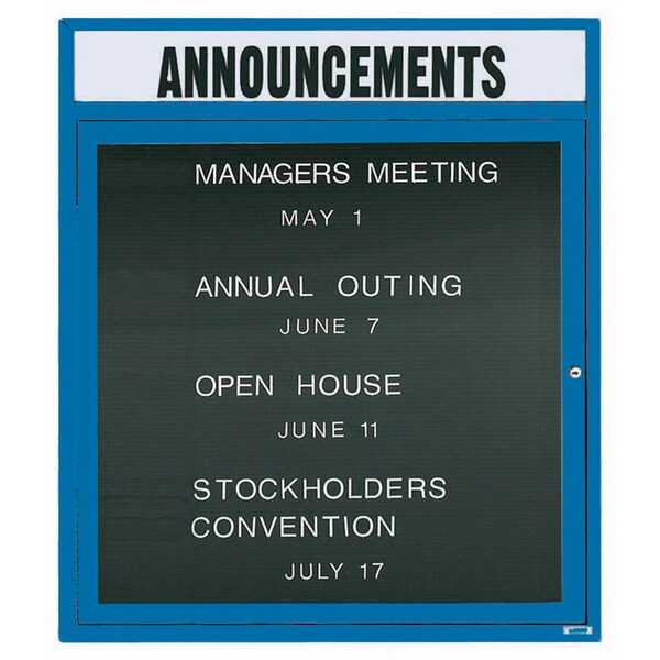 Outdoor Enclosed Aluminum Directory Boards are made of custom extruded parts engineered to provide accurate, durable and handsome cabinets. All corners are neatly mitered and assembled with Heavy duty reinforcements and fasteners. The black vinyl covered grooved rear panel designed to accommodate changeable letters with tabs spaced on 1/4" centers. Supplied with a blank header panel, ready for your custom vinyl lettering. Lettering is not included and must be applied by the customer. Blue Powder Coated Finish Size 36"Hx30"W 1 Door