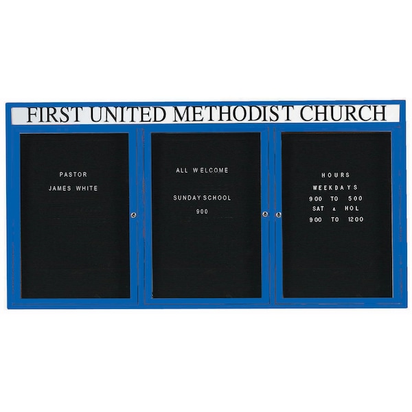 Outdoor Enclosed Aluminum Directory Boards are made of custom extruded parts engineered to provide accurate, durable and handsome cabinets. All corners are neatly mitered and assembled with Heavy duty reinforcements and fasteners. The black vinyl covered grooved rear panel designed to accommodate changeable letters with tabs spaced on 1/4" centers. Supplied with a blank header panel, ready for your custom vinyl lettering. Lettering is not included and must be applied by the customer. Blue Powder Coated Finish Size 36"Hx72"W 3 Doors