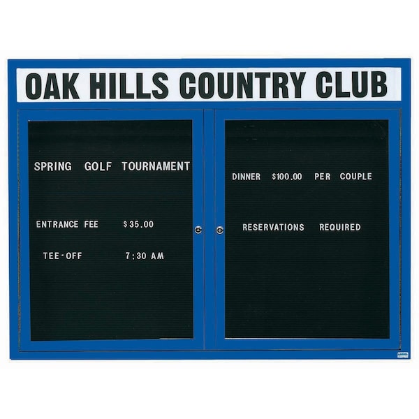 Outdoor Enclosed Aluminum Directory Boards are made of custom extruded parts engineered to provide accurate, durable and handsome cabinets. All corners are neatly mitered and assembled with Heavy duty reinforcements and fasteners. The black vinyl covered grooved rear panel designed to accommodate changeable letters with tabs spaced on 1/4" centers. Supplied with a blank header panel, ready for your custom vinyl lettering. Lettering is not included and must be applied by the customer. Blue Powder Coated Finish Size 48"Hx60"W 2 Doors