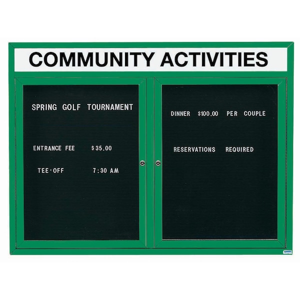 Outdoor Enclosed Aluminum Directory Boards are made of custom extruded parts engineered to provide accurate, durable and handsome cabinets. All corners are neatly mitered and assembled with Heavy duty reinforcements and fasteners. The black vinyl covered grooved rear panel designed to accommodate changeable letters with tabs spaced on 1/4" centers. Supplied with a blank header panel, ready for your custom vinyl lettering. Lettering is not included and must be applied by the customer. Green Powder Coated Finish Size 36"Hx48"W 2 Doors