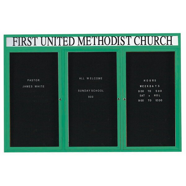 Outdoor Enclosed Aluminum Directory Boards are made of custom extruded parts engineered to provide accurate, durable and handsome cabinets. All corners are neatly mitered and assembled with Heavy duty reinforcements and fasteners. The black vinyl covered grooved rear panel designed to accommodate changeable letters with tabs spaced on 1/4" centers. Supplied with a blank header panel, ready for your custom vinyl lettering. Lettering is not included and must be applied by the customer. Green Powder Coated Finish Size 48"Hx72"W 3 Doors