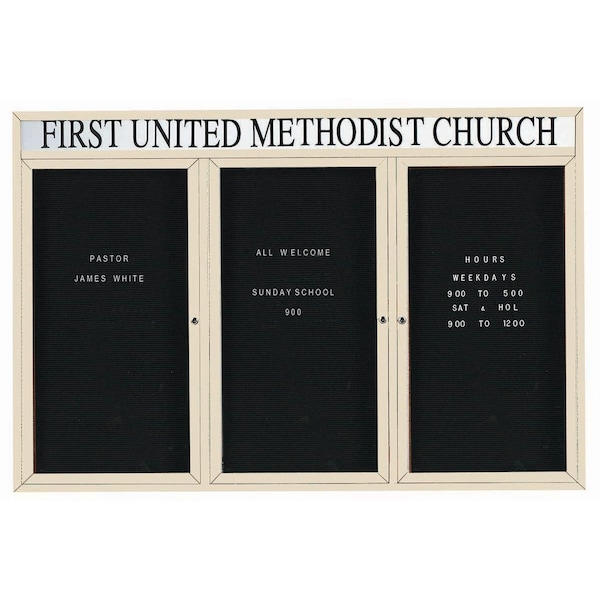 Outdoor Enclosed Aluminum Directory Boards are made of custom extruded parts engineered to provide accurate, durable and handsome cabinets. All corners are neatly mitered and assembled with Heavy duty reinforcements and fasteners. The black vinyl covered grooved rear panel designed to accommodate changeable letters with tabs spaced on 1/4" centers. Supplied with a blank header panel, ready for your custom vinyl lettering. Lettering is not included and must be applied by the customer. Ivory Powder Coated Finish Size 48"Hx72"W 3 Doors