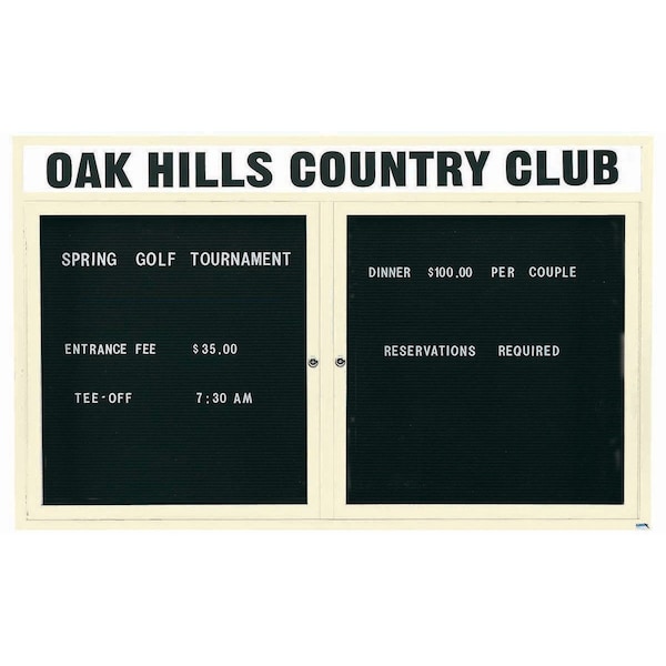 Outdoor Enclosed Aluminum Directory Boards are made of custom extruded parts engineered to provide accurate, durable and handsome cabinets. All corners are neatly mitered and assembled with Heavy duty reinforcements and fasteners. The black vinyl covered grooved rear panel designed to accommodate changeable letters with tabs spaced on 1/4" centers. Supplied with a blank header panel, ready for your custom vinyl lettering. Lettering is not included and must be applied by the customer. Ivory Powder Coated Finish Size 48"Hx72"W 2 Doors
