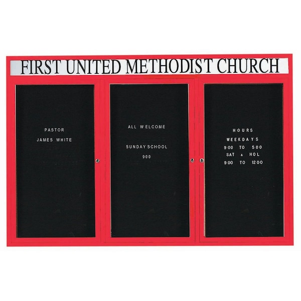 Outdoor Enclosed Aluminum Directory Boards are made of custom extruded parts engineered to provide accurate, durable and handsome cabinets. All corners are neatly mitered and assembled with Heavy duty reinforcements and fasteners. The black vinyl covered grooved rear panel designed to accommodate changeable letters with tabs spaced on 1/4" centers. Supplied with a blank header panel, ready for your custom vinyl lettering. Lettering is not included and must be applied by the customer. Red Powder Coated Finish Size 48"Hx72"W 3 Doors